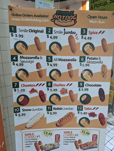 Smile Hotdog offers a variety of mouth-watering options on their menu, blending flavors from different cultures into one unforgettable experience. Their Corn Dogs are a must-try, especially the Smile Original, which is a classic crispy favorite. If you're looking for something bigger, the Smile Jumbo offers a hearty, indulgent treat, while the SpiceMozzarella & Sausage brings a delightful combination of spice and cheesy goodness. For mozzarella lovers, the All Mozzarella corn dog delivers gooey, cheesy perfection wrapped in a crispy golden batter.